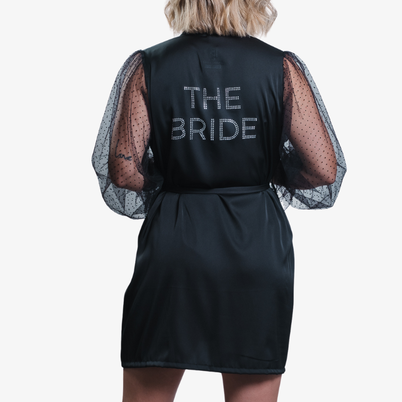 Es de seda con mangas de tul con puntitos de terciopelo, mangas globo y puño elasticado para un toque femenino y diferente. En la espalda tiene en pedrería plateada "THE BRIDE". Es suavecita y tiene una caída deliciosa.