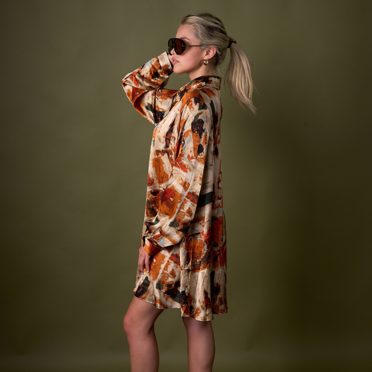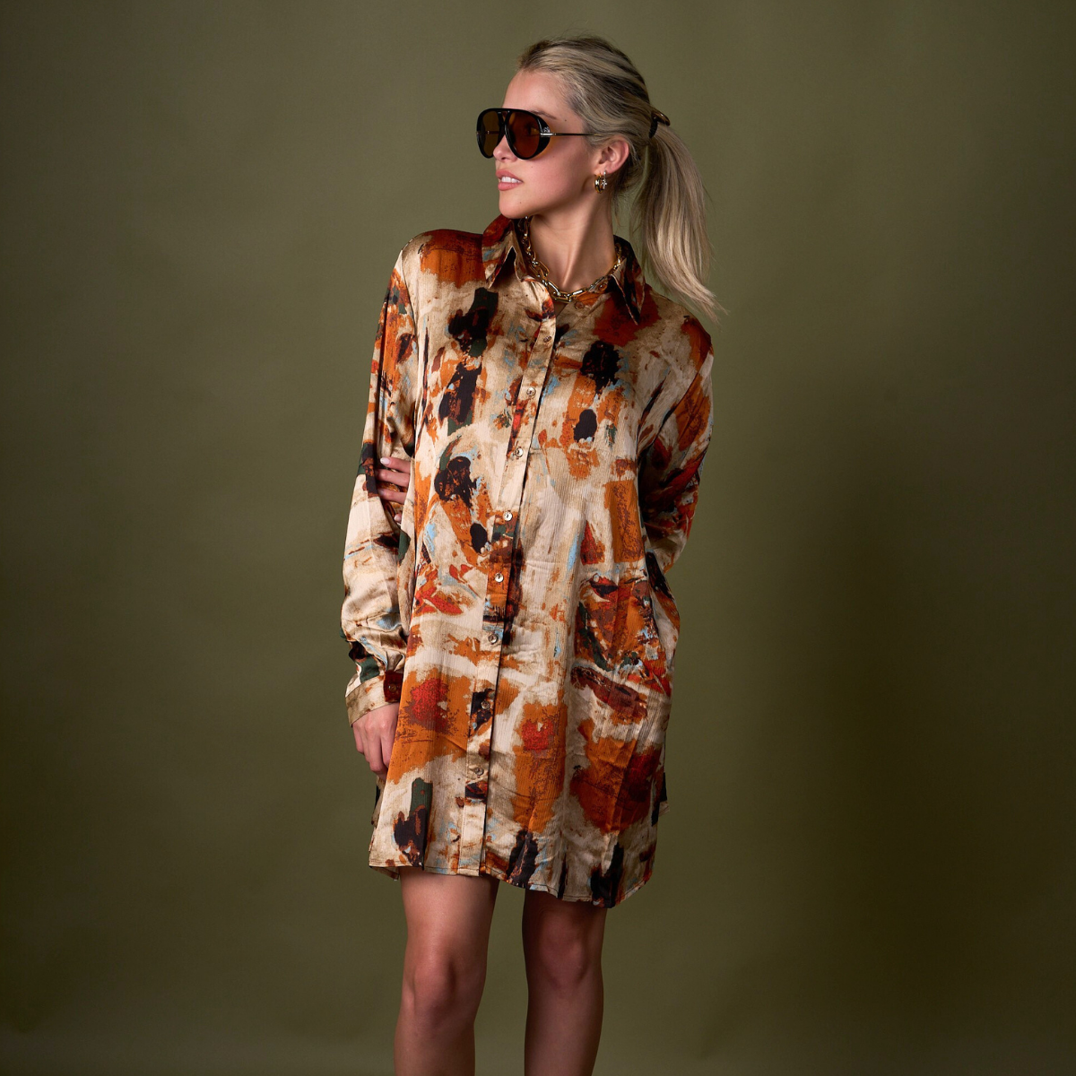 Una prenda statement que no pasa desapercibida. El Blusón Manchas Naranjo destaca por su vibrante estampado abstracto en tonos tierra, naranjo y negro, que le otorgan fuerza y personalidad a cualquier look. Su silueta oversize y su tela liviana y sedosa lo hacen ideal para usar tanto como blusón largo o mini vestido.