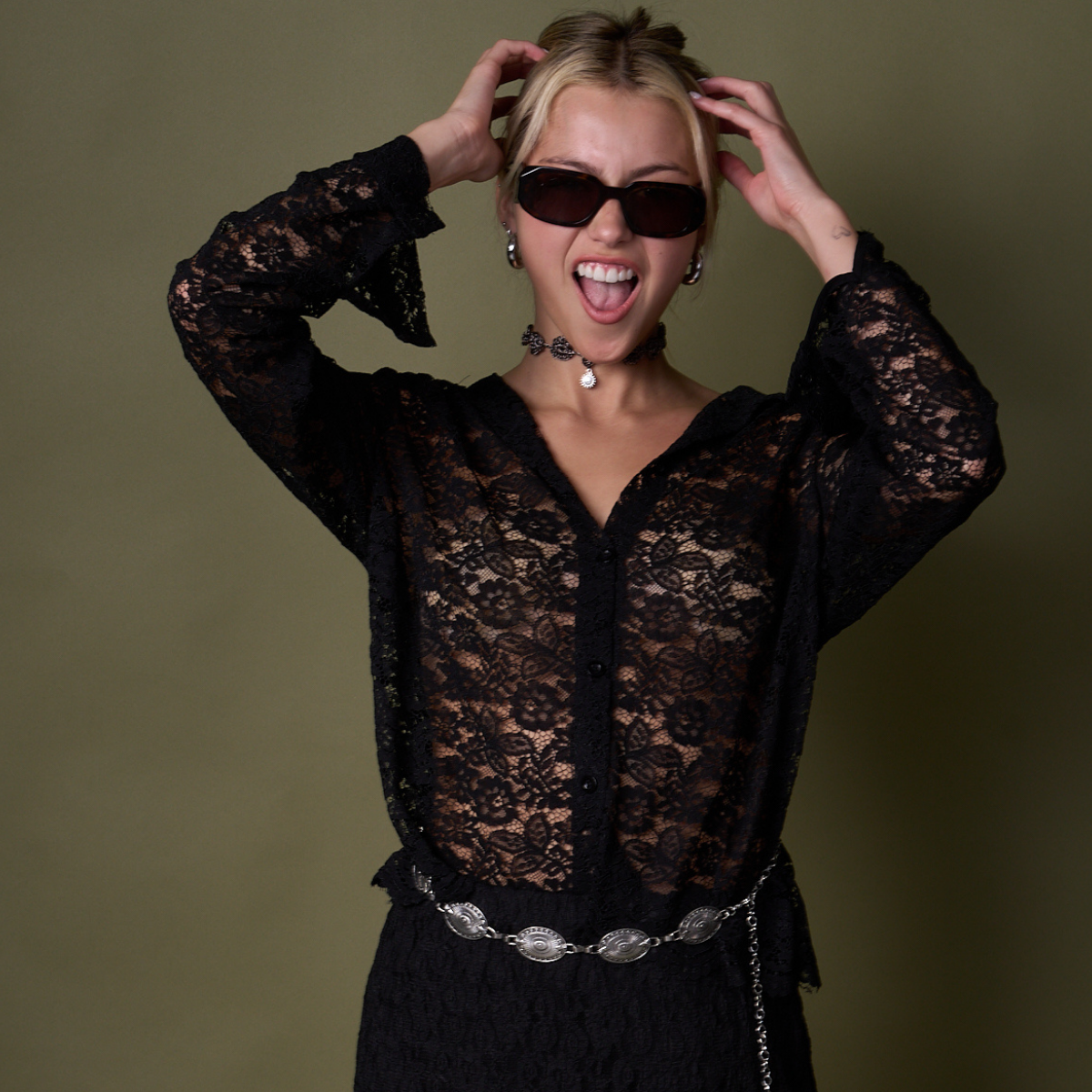 Transparente, atrevida y ultra femenina. La Camisa de Encaje Negra es una pieza statement que transforma cualquier look en un acto de estilo.