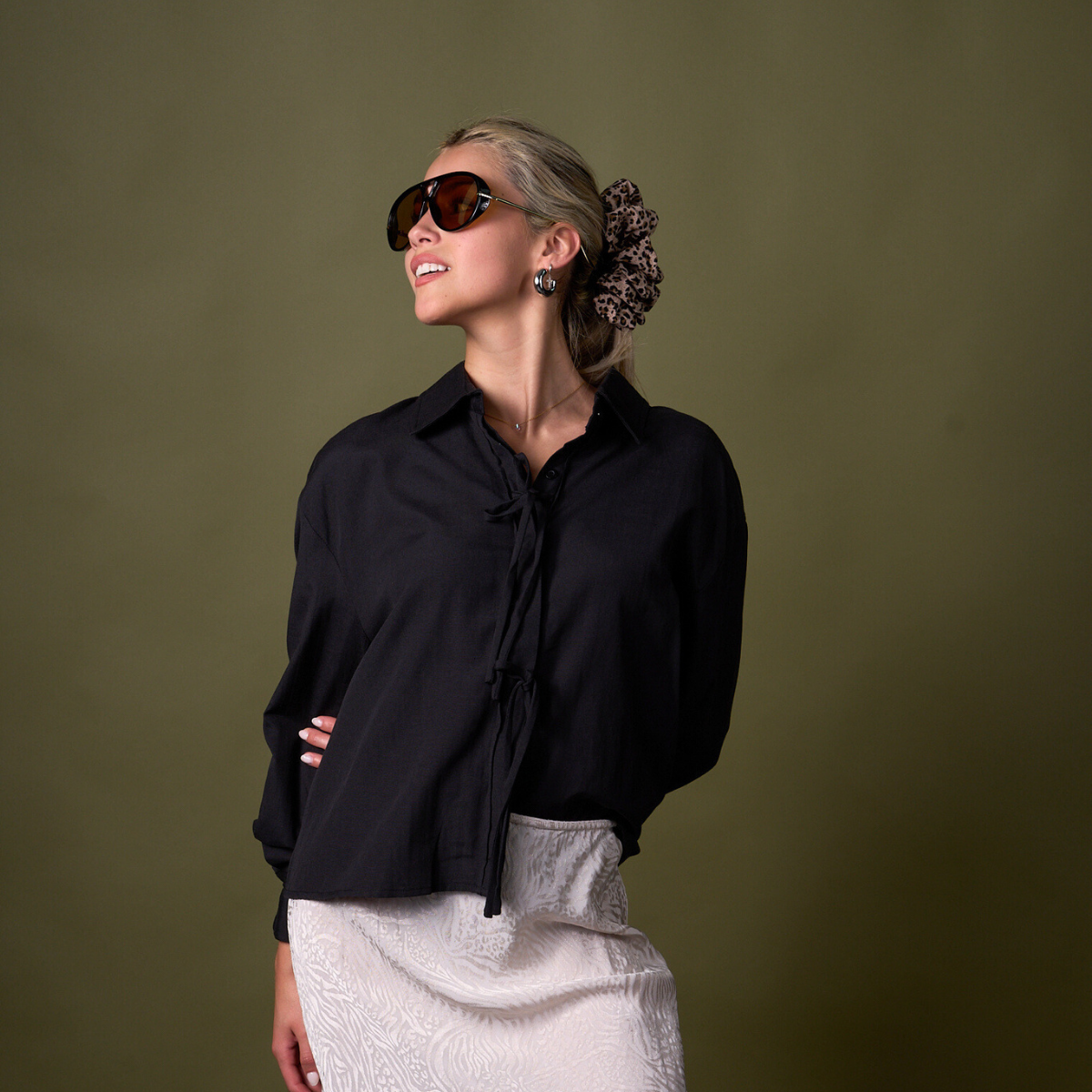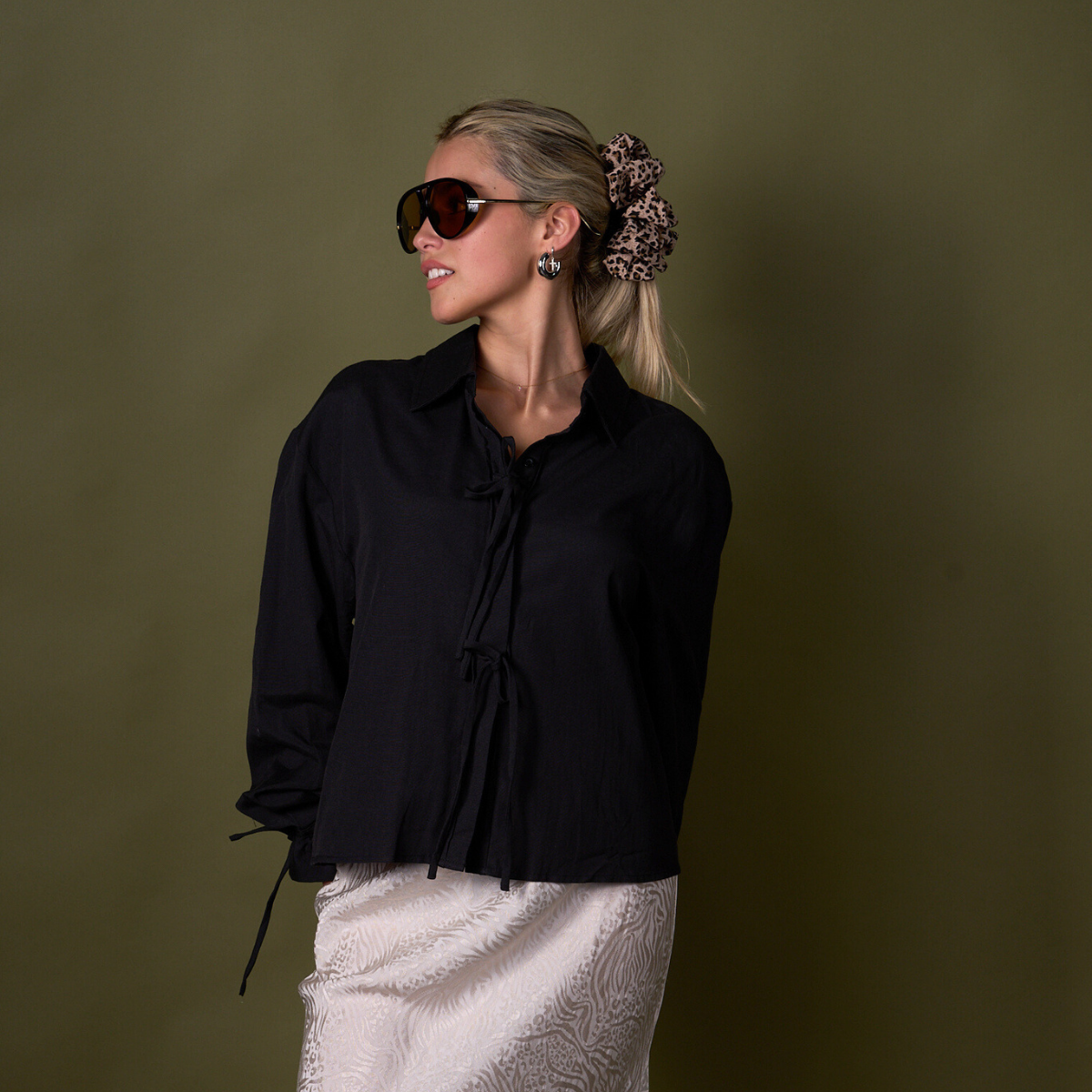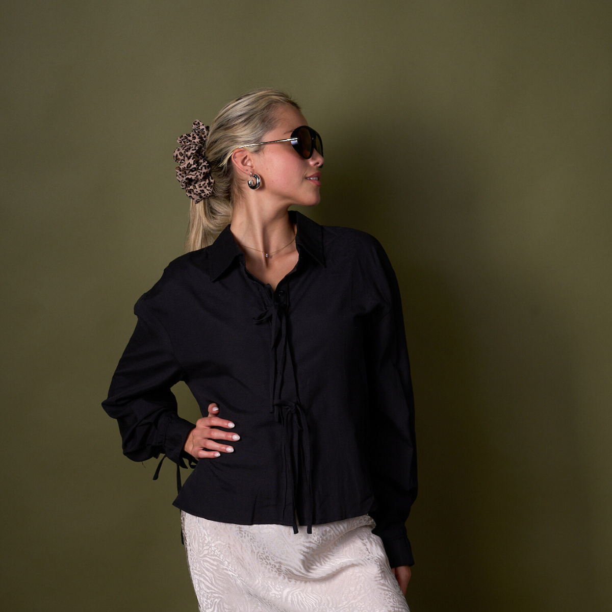 La Camisa José en color negro es una opción elegante y versátil que se adapta tanto a looks casuales como más arreglados. Su corte recto y los lazos frontales con detalles ajustables en las mangas combinan funcionalidad y estilo con un toque romántico y actual. Confeccionada en tela liviana, es ideal para vestir con frescura y sofisticación.