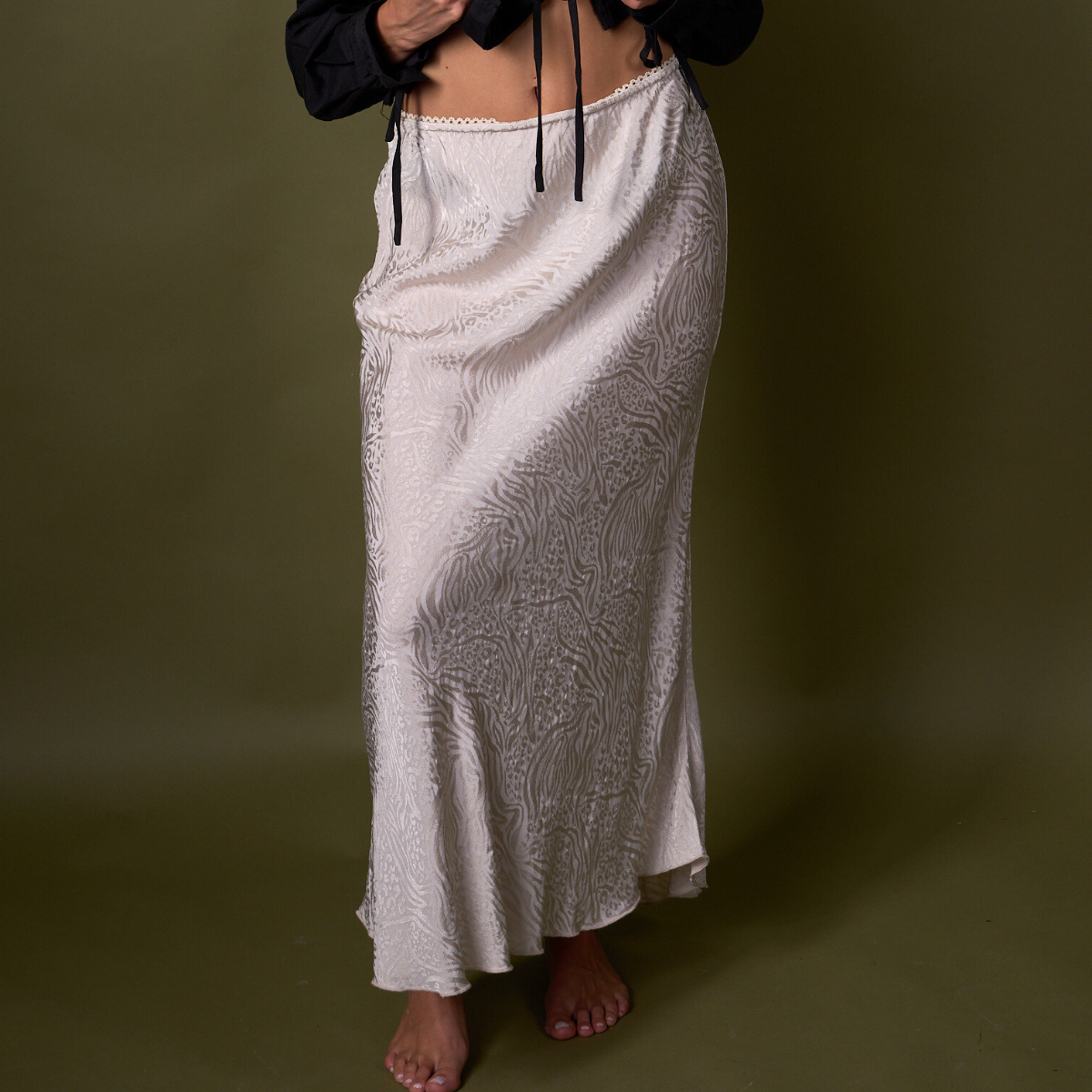 Una prenda elegante con un twist salvaje. La falda Andrea en tono beige deslumbra con su textura suave y su delicado estampado monocromo de leopardo, ideal para quienes buscan sofisticación sin perder el toque atrevido. Su calce al cuerpo y caída fluida realzan la silueta de forma sutil, mientras que la pretina elastizada en la cintura asegura comodidad.