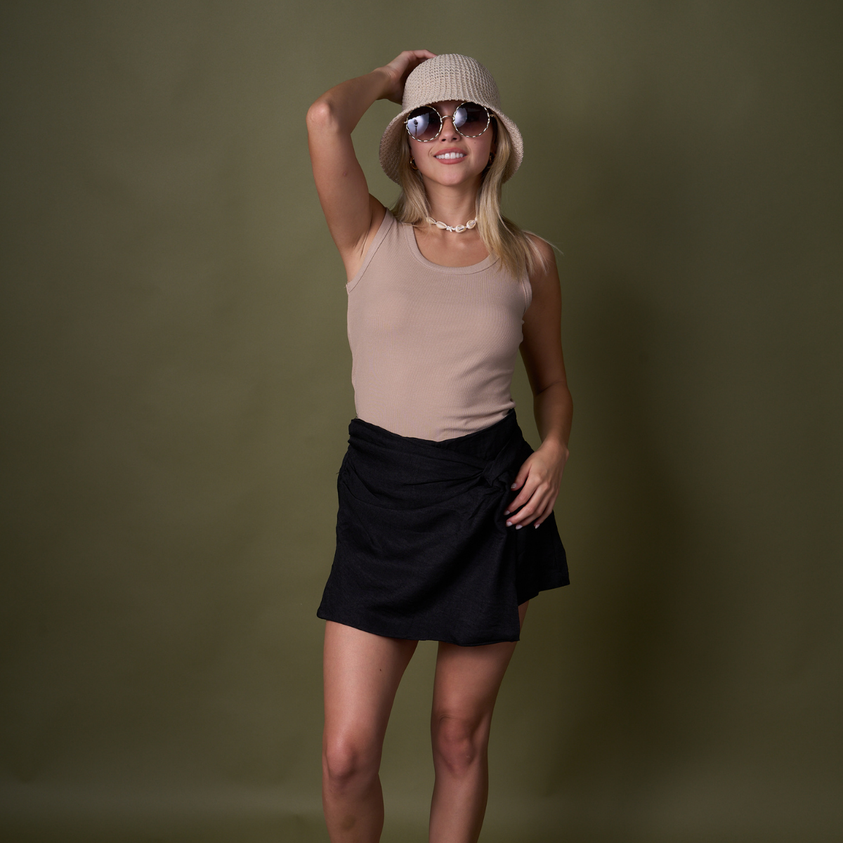 Minimalista pero con impacto, el short Rafaella en color negro es un básico con giro moderno gracias a su diseño tipo pareo. El nudo lateral le da textura y movimiento, convirtiéndola en una prenda infalible tanto para el día como la noche. Su color clásico la hace combinable con todo, siendo ideal para armar looks más sobrios o sofisticados.